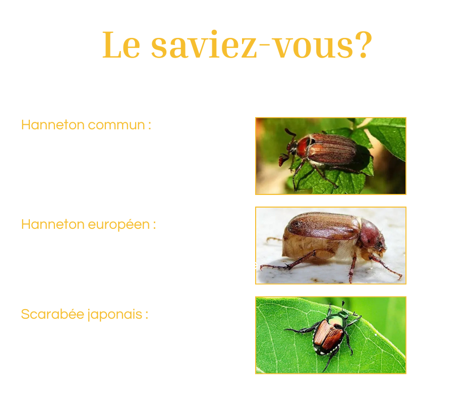 Entre mai et début juillet, selon la température, le hanneton commun, le scarabée japonais et le hanneton européen émergent du sol pour parcourir différents terrains.